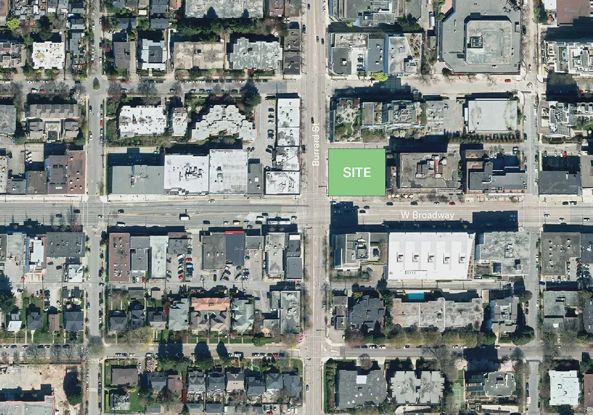 The site consists of the property located at 1795 West Broadway, situated on the northeast corner of Broadway and Burrard where a gas station is currently operating.