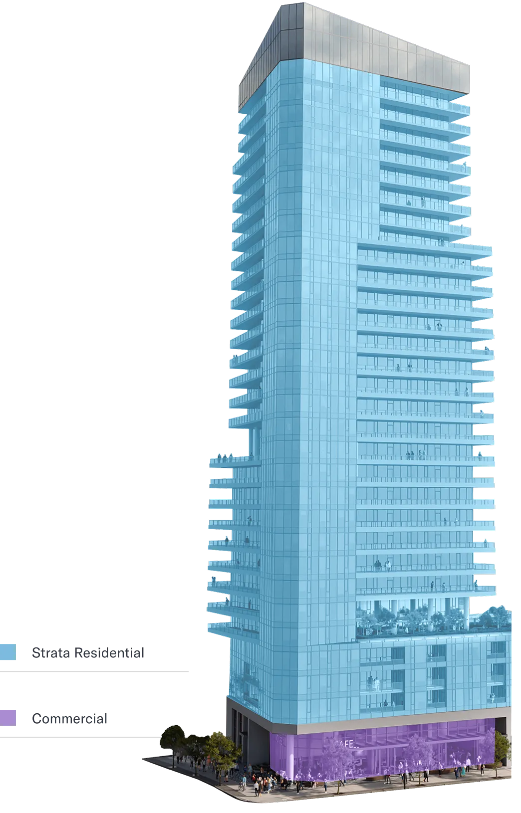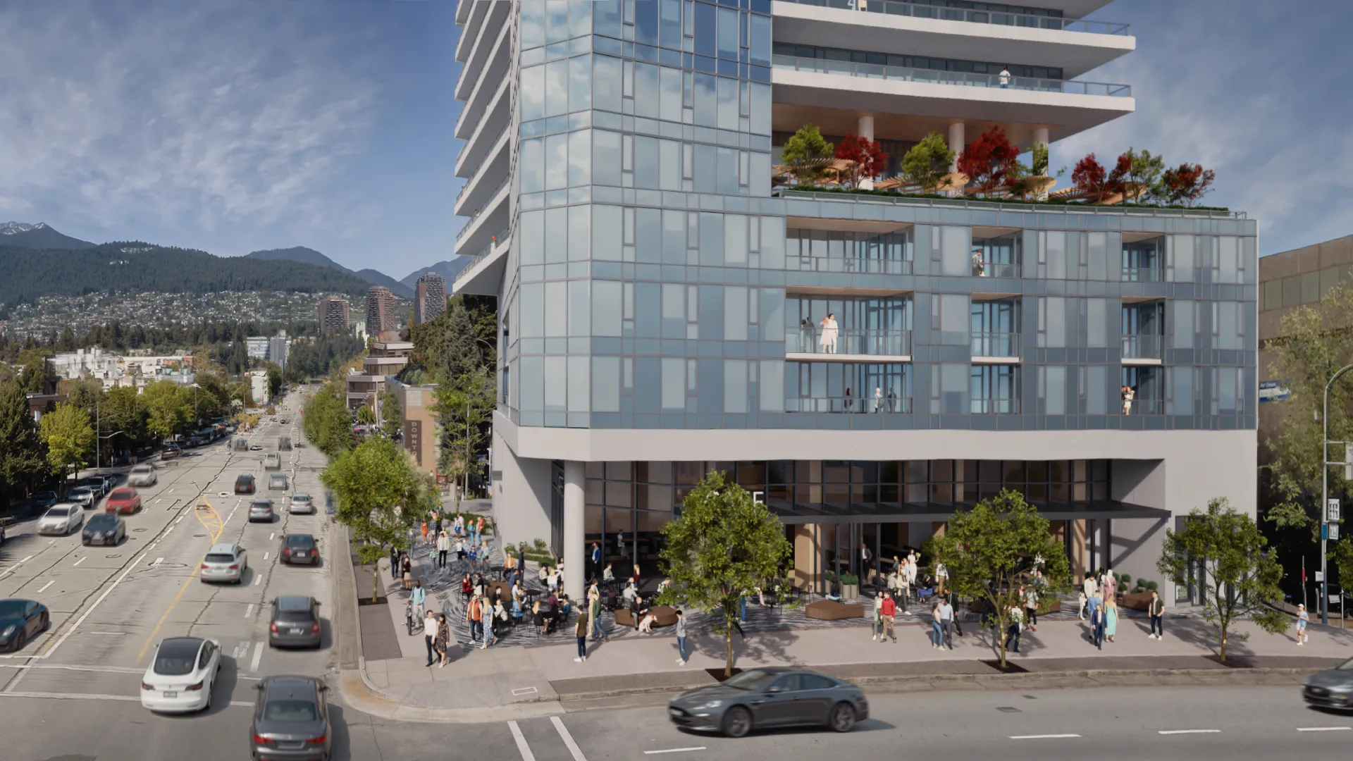 Yes. The project proposes a public plaza and café (in the ground retail space) on the corner of Burrard and Broadway, which will serve as a gathering place for residents, commercial and residential neighbours.