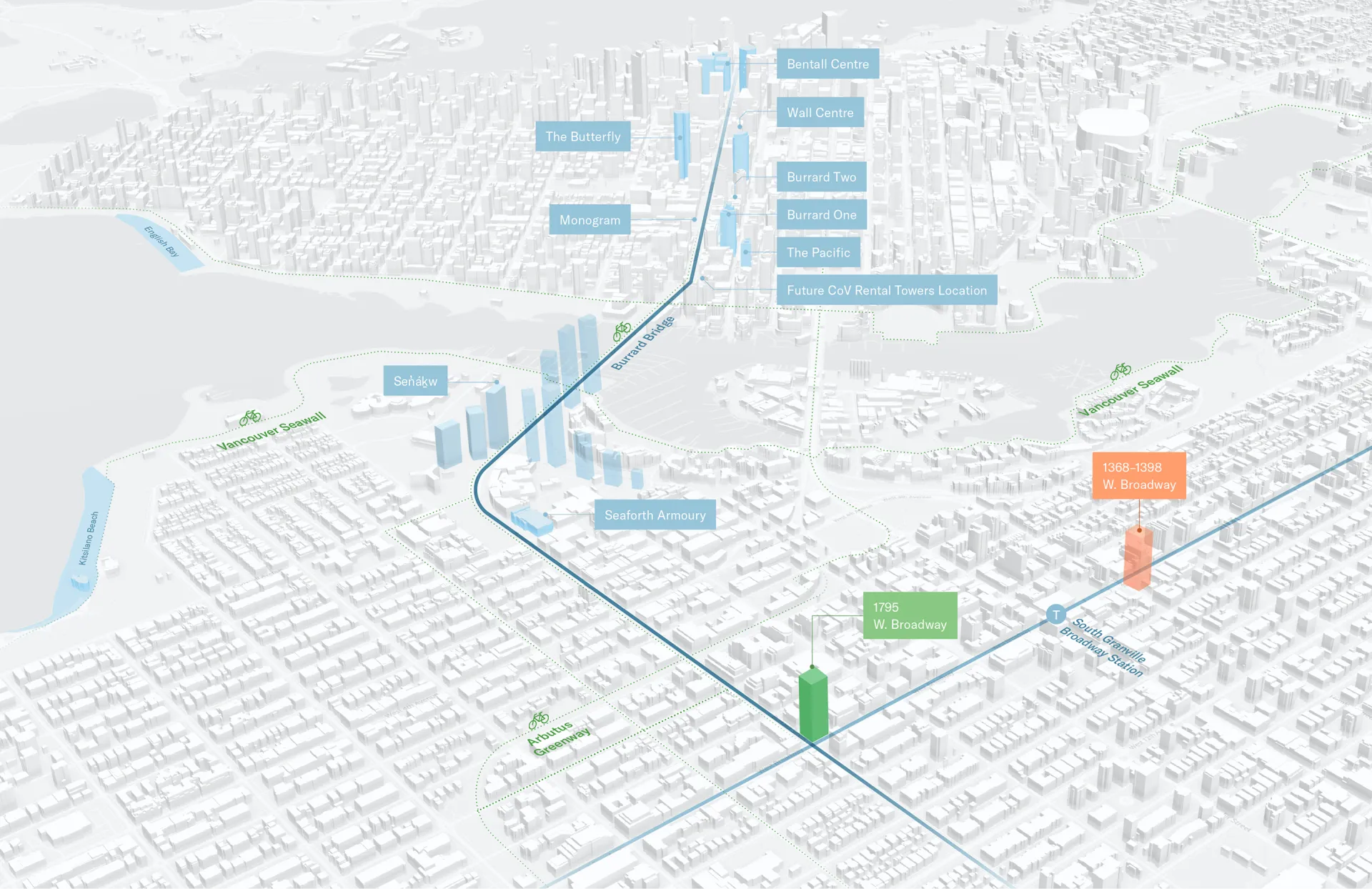 Strategically located near two Broadway Subway stations, the Burrard Corridor, and the Arbutus Greenway, this project supports sustainable, high-density living with exceptional transit access and multiple bicycle routes.